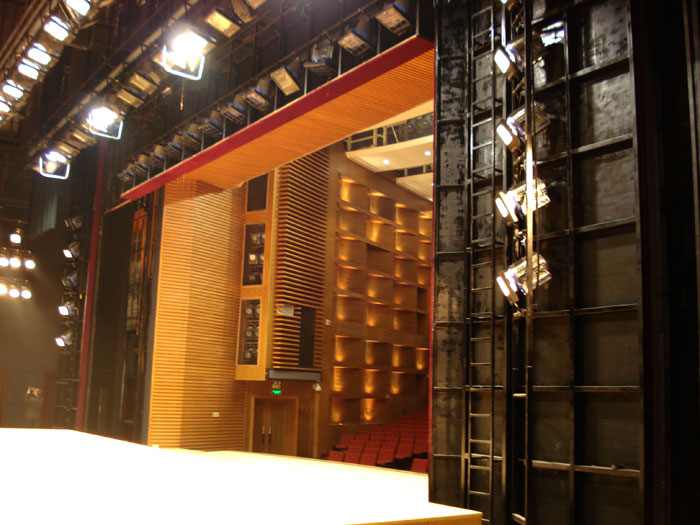 活动假台口具有改变台口尺寸,安装各种灯具,适当调节舞台音响效果,摄像拍剧照及特技摄影等功能,使舞台更适合各种剧种剧情的演出要求。活动假台口由电动曳引式升降片和电动(或手动)左右两侧片组成。侧片采用悬挂式及下部为薄片的结构,避免了下置式及整块式占据演出黄金地段的不足及对台面的破坏作用。三片均可上人操作。